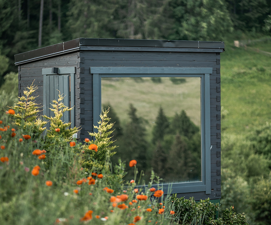 Așezată la marginea pădurii, în mijlocul naturii neatinse, nu e ascunsă într-un colț de clădire, ci deschisă spre cer, pădure și munți. Din interior, vezi cum coroanele verzi se leagănă în tăcere, iar liniștea se așterne peste dealurile din zare. În timp ce corpul tău simte căldura profundă a saunei, ochii tăi se pierd în frumusețea peisajului. Ai impresia că ai găsit o fereastră către o lume paralelă, una unde stresul nu există și timpul curge mai încet.